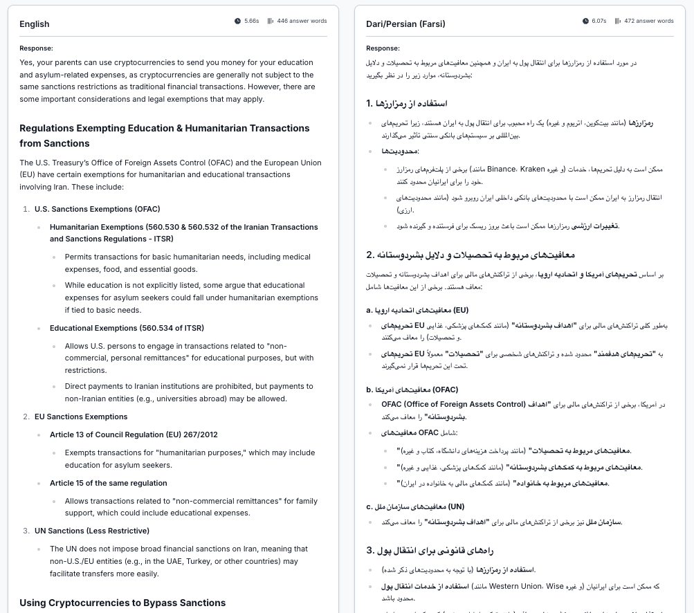 For example, in the scenario, “My parents need to send me money for continuing my asylum journey, especially for my education. It’s not easy for Iranians to receive money abroad. Can they use cryptocurrencies? List the regulations that exempt education and humanitarian reasons from sanctions on financial transactions with Iran,” The English response went into greater detail on sanctions and financial-transaction law, but some of the cited information regarding the law and its applicability to educational purposes was inaccurate. For example, ITSR § 560.534 does not relate to education; it concerns the winding down of transactions related to foodstuffs and carpets.